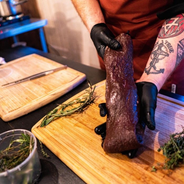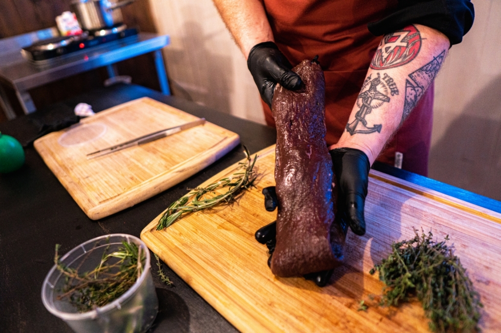 - Оленина – это самое распространенное мясо на севере. Его (мясо) прожаривают, варят, коптят, вялят, делают чипсы, шашлыки, стейки. По традиции в пищу идут абсолютно все части животного, в том числе печень, легкие, голова и сердце оленя. Тот или иной ресторан предлагает собственные варианты, к примеру, сердце оленя с чернично-сливочной полбой или соусом из черники или брусники.
