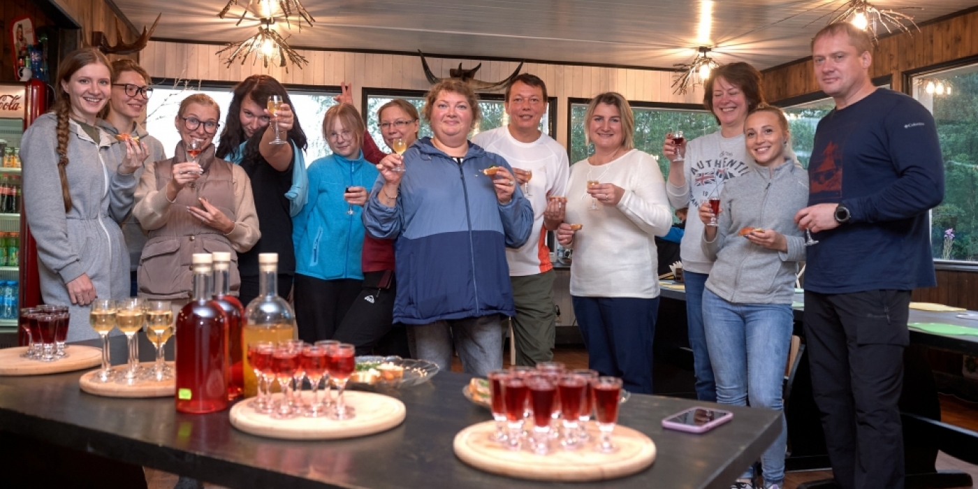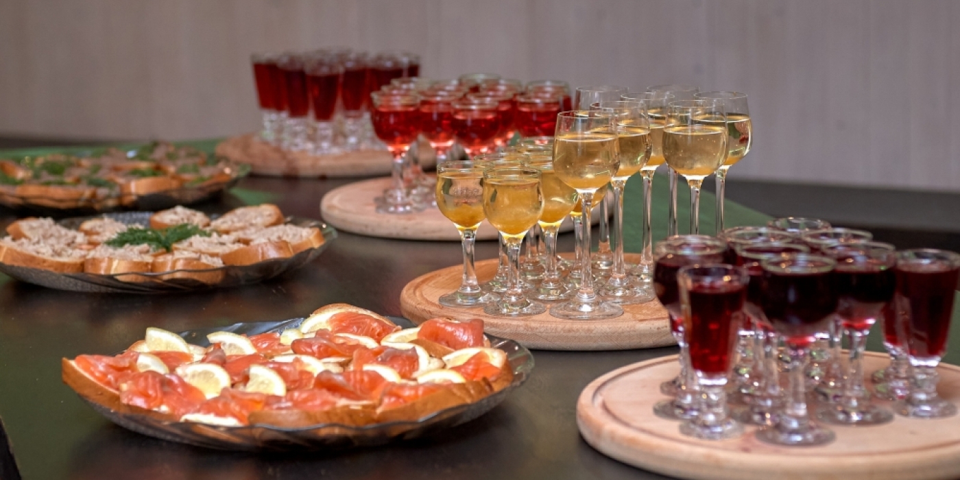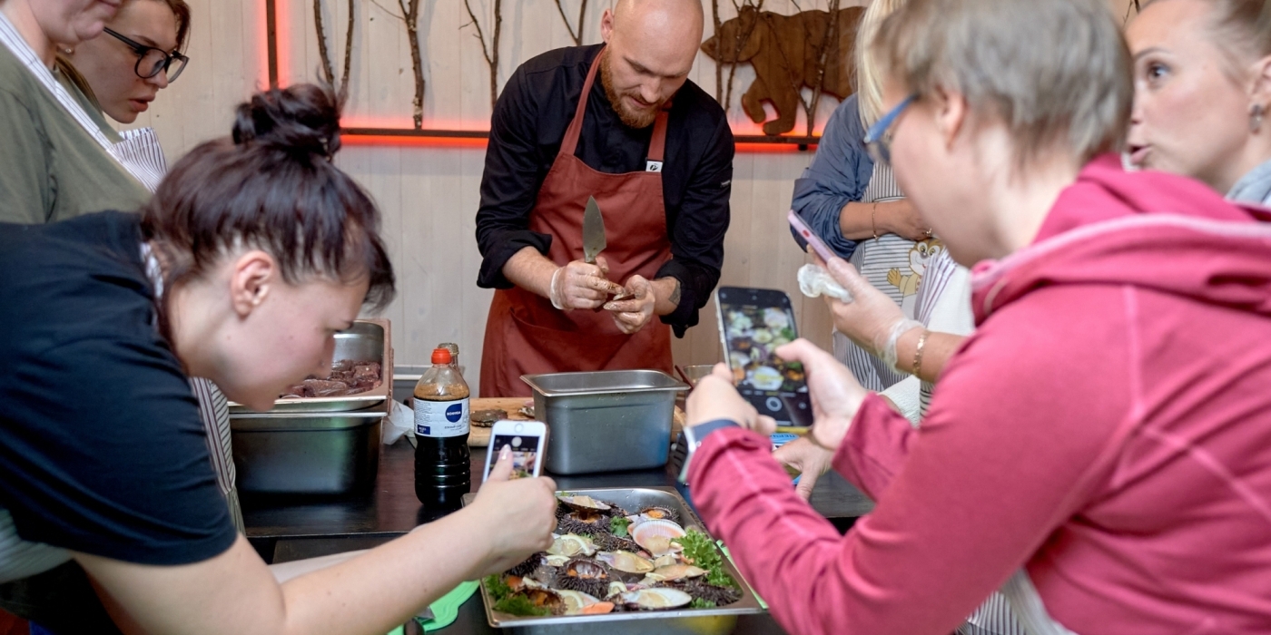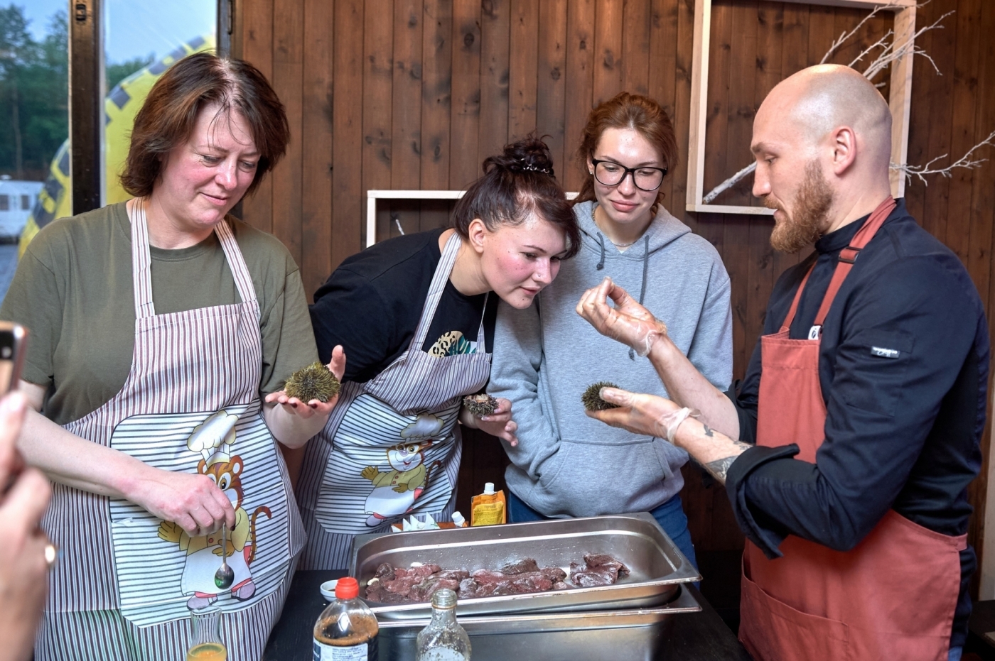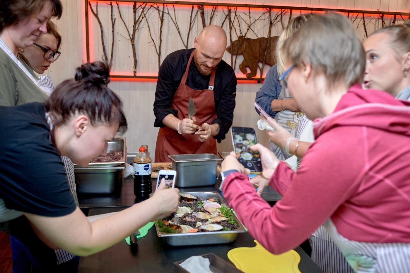 После знакомства с шеф-поваром, который будет проводить мастер-класс – гостям предлагают дегустационный сет из фирменных настоек на северных ягодах и легкие закуски (канапе из печени трески, семги в сырном соусе, паштет из оленины).