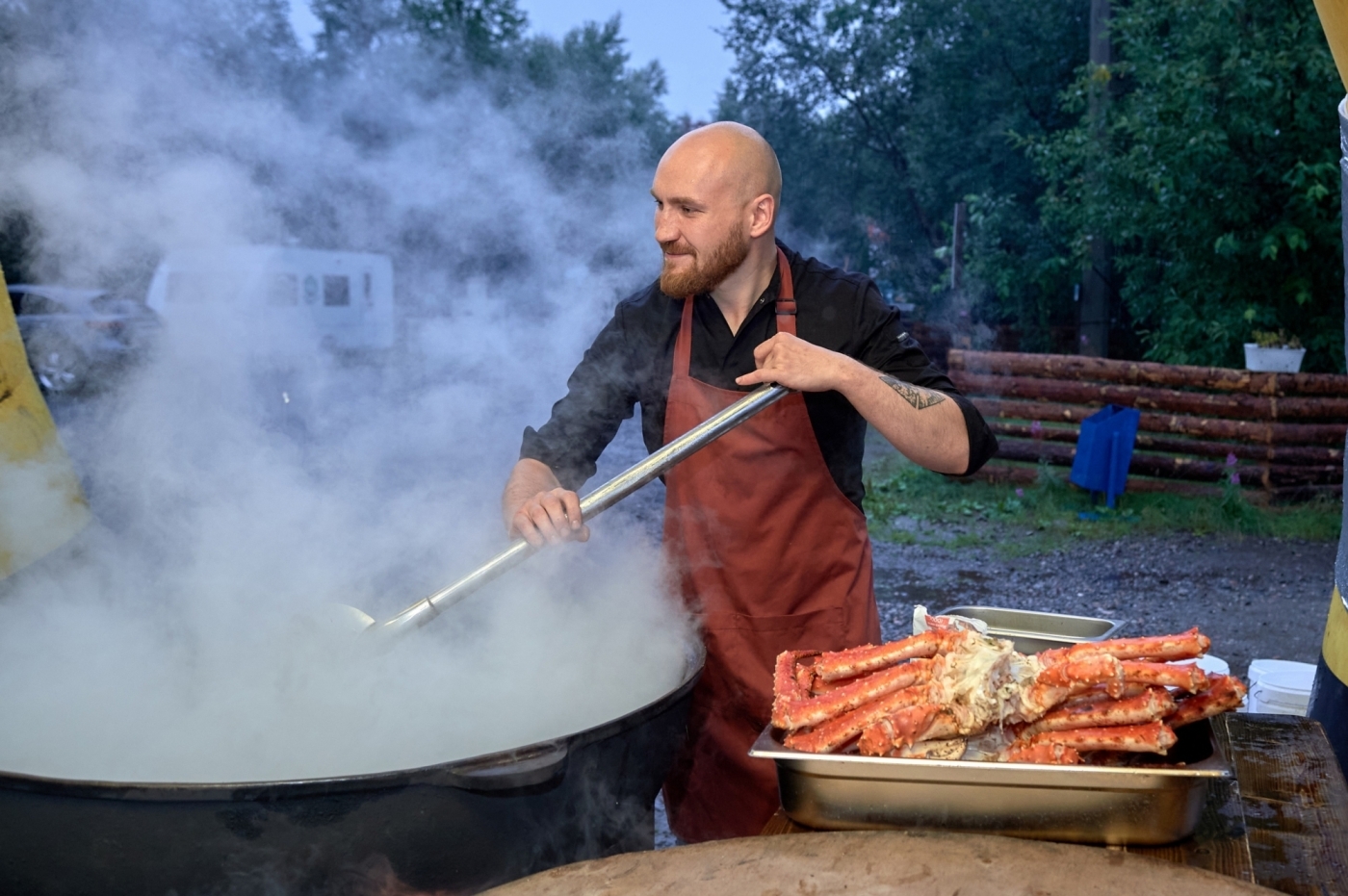 Меню: арктические гребешки, камчатский краб, арктические морские ежи, оленина, овощи-гриль по арктическому рецепту.