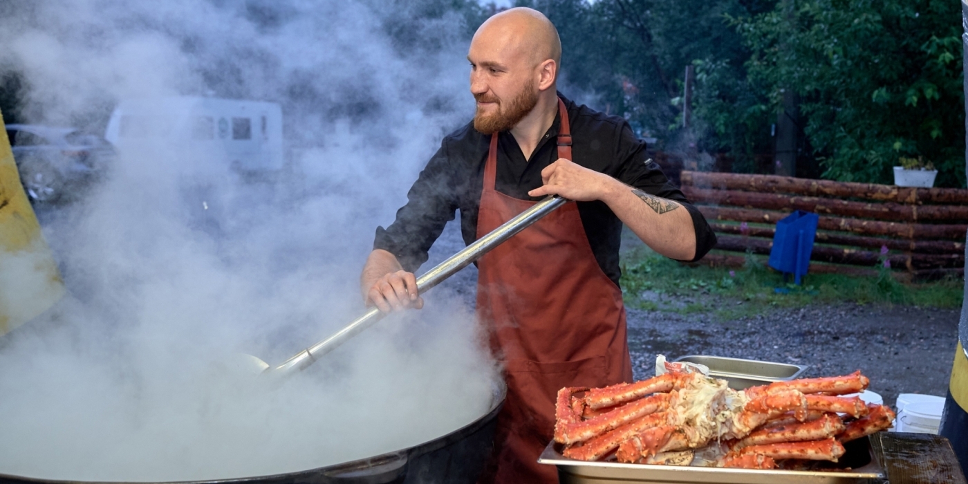 Приготовление Камчатского краба (фаланги краба отваривают в общем казане). В состав входит Камчатский краб (350 гр.), лимон, соус