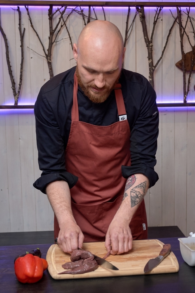 Приготовление ленивой мышцы северного оленя на гриле. В состав входит охлажденная оленина (200 гр.), соль, перец, оливковое масло