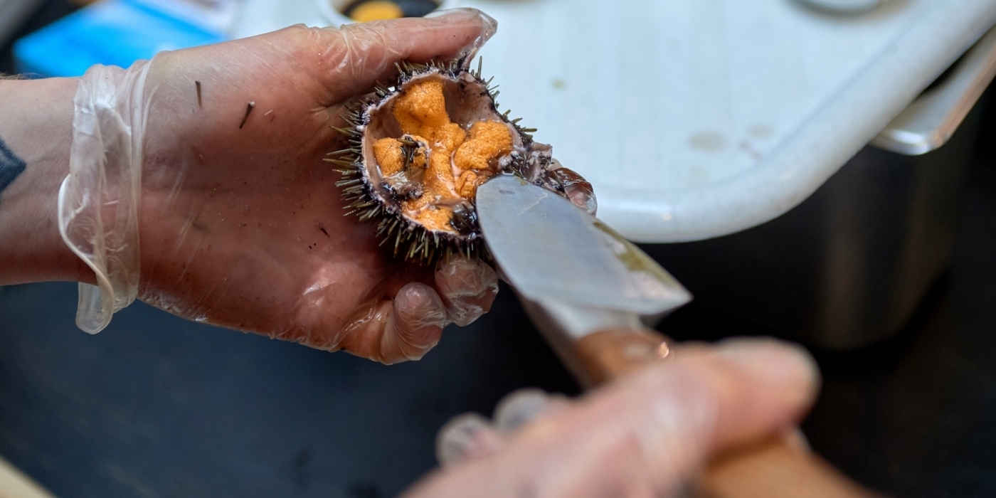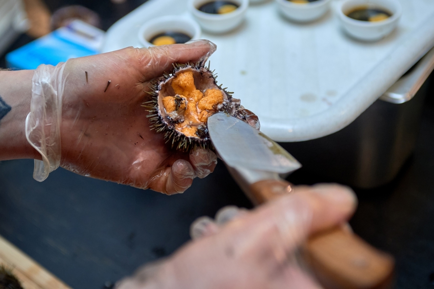 Мастер-класс по открытию и приготовлению арктических морских ежей (2 шт). Дополнительно подается соевый соус, перепелиное яйцо (сок лимона по необходимости)