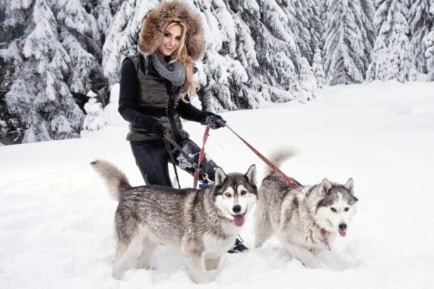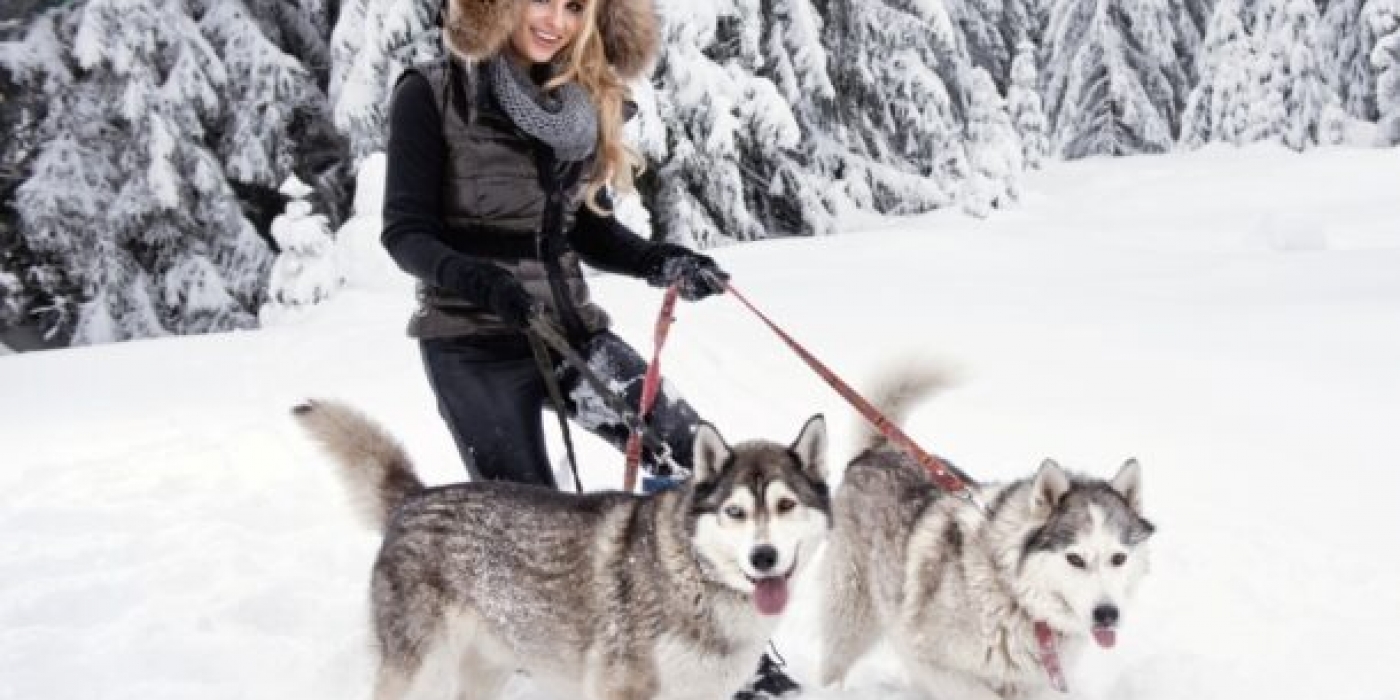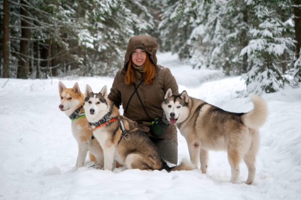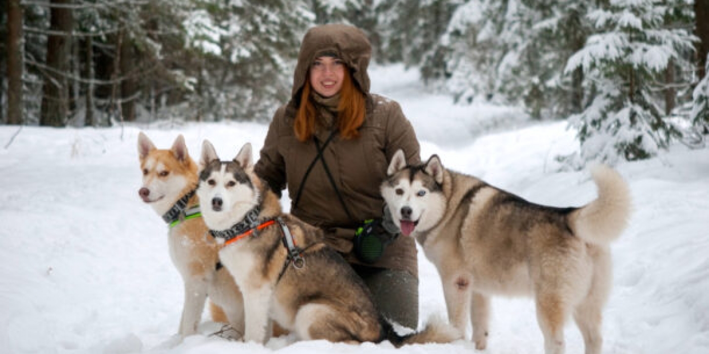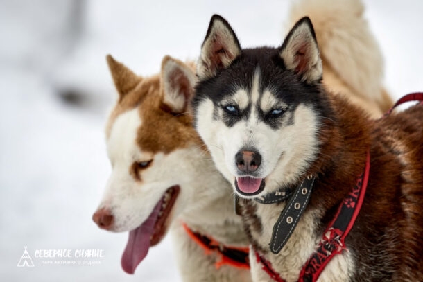- активная прогулка с собаками хаски по живописному лесу;