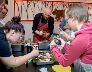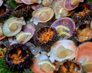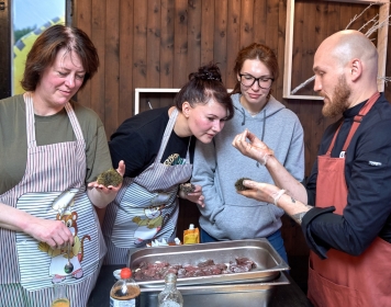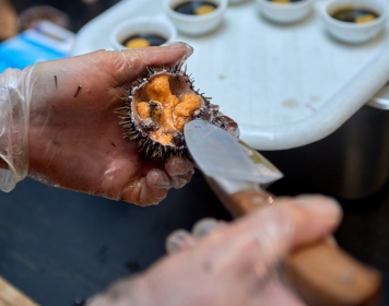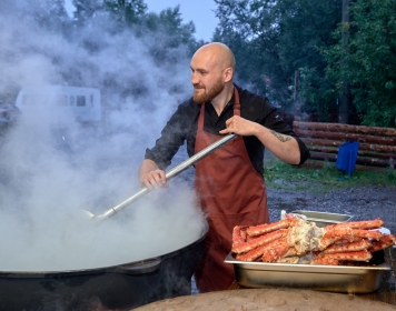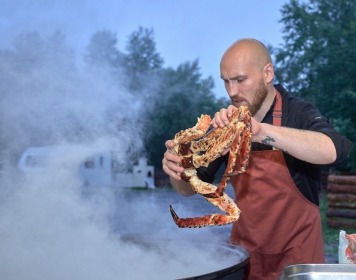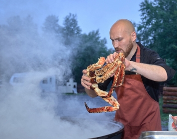 Меню: арктические гребешки, камчатский краб, арктические морские ежи, оленина, овощи-гриль по арктическому рецепту.
